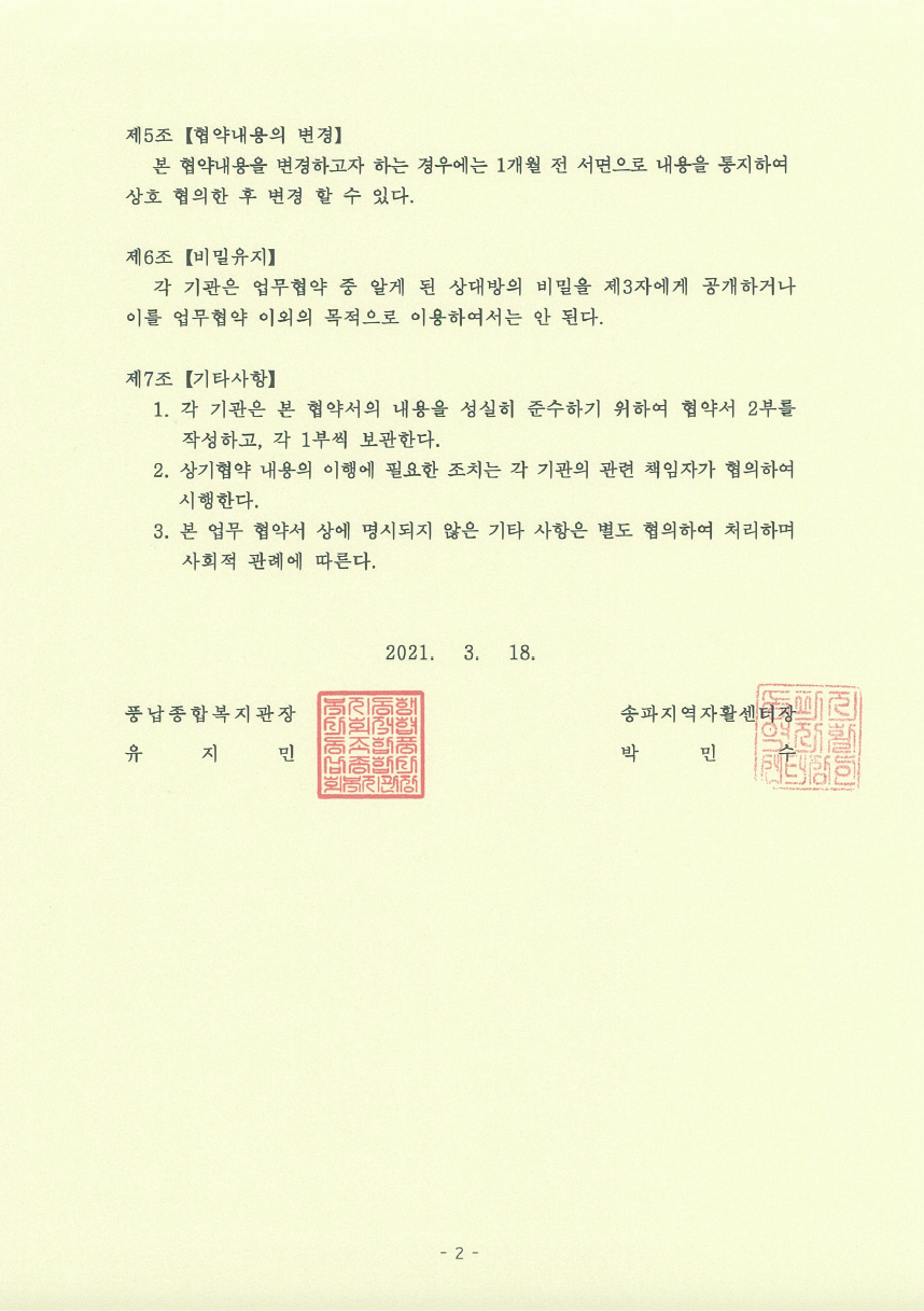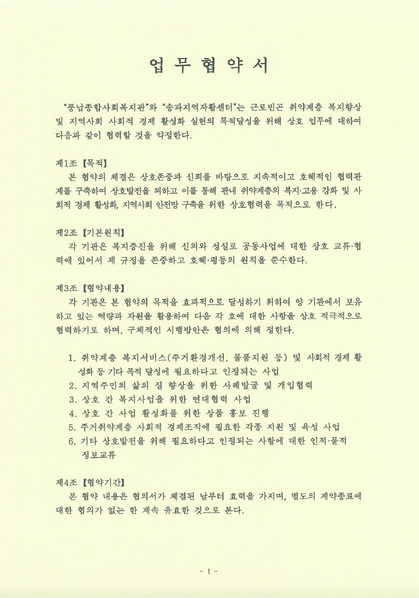 풍납종합사회복지관 업무협약서 페이지 정보 작성자 최고관리자 댓글 댓글 0건 조회Hit 162회 작성일Date 24-01-25 15:31 본문 풍납종합사회복지관 업무협약서 목록 이전글여성친화일촌기업 협약서 24.01.25 다음글(사)한국건강관리협회 서울강남지부 업무협약서 24.01.25 댓글 0 댓글목록 등록된 댓글이 없습니다.