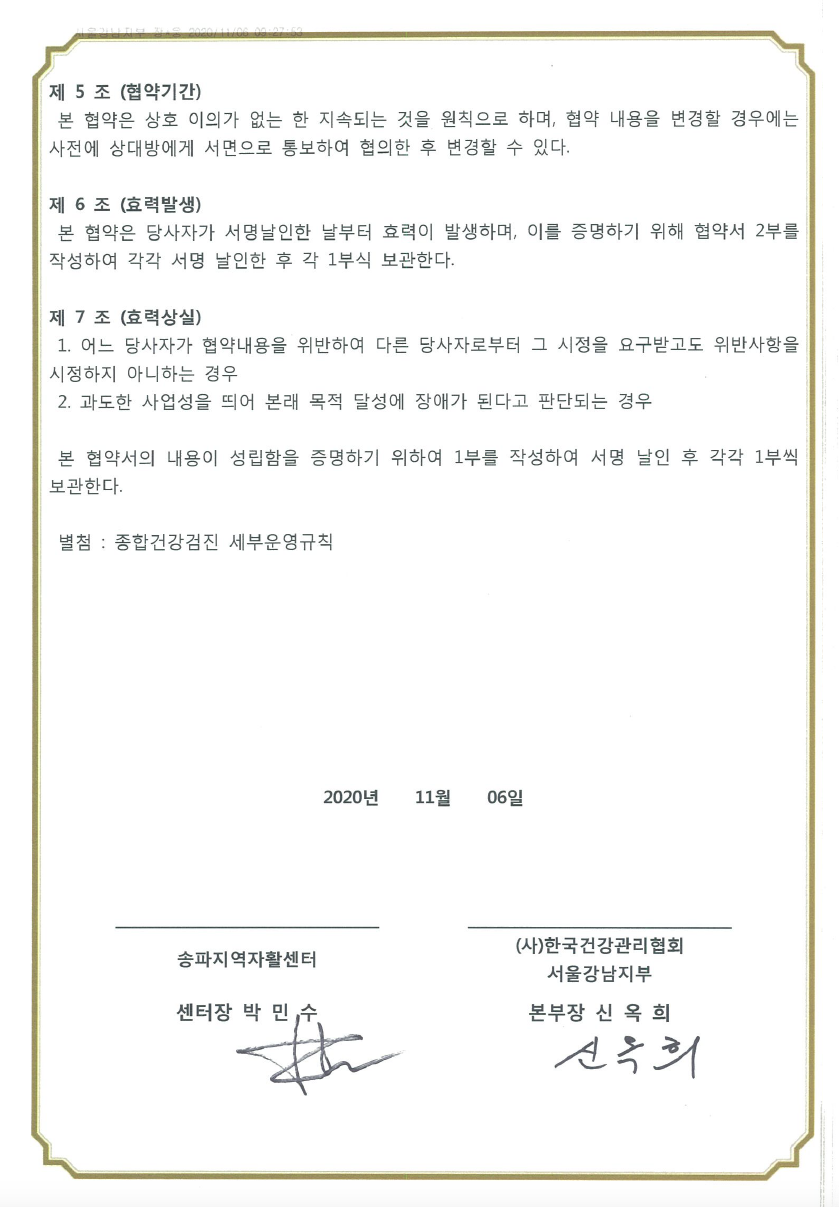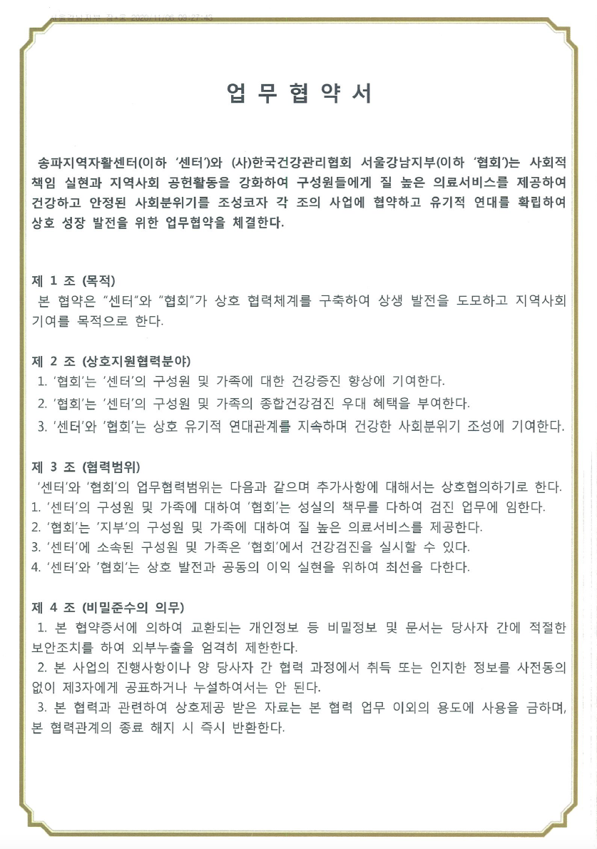 (사)한국건강관리협회 서울강남지부 업무협약서 페이지 정보 작성자 최고관리자 댓글 댓글 0건 조회Hit 149회 작성일Date 24-01-25 15:15 본문 (사)한국건강관리협회 서울강남지부 업무협약서 목록 이전글풍납종합사회복지관 업무협약서 24.01.25 댓글 0 댓글목록 등록된 댓글이 없습니다.