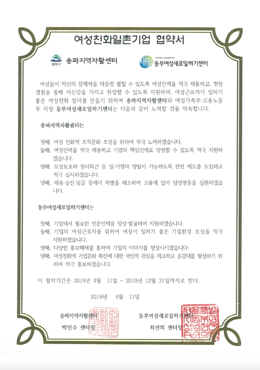 여성친화일촌기업 협약서 페이지 정보 작성자 최고관리자 댓글 댓글 0건 조회Hit 134회 작성일Date 24-01-25 15:34 본문 여성친화일촌기업 협약서 목록 이전글송파여성문화회관 업무협약서 24.01.25 다음글풍납종합사회복지관 업무협약서 24.01.25 댓글 0 댓글목록 등록된 댓글이 없습니다.