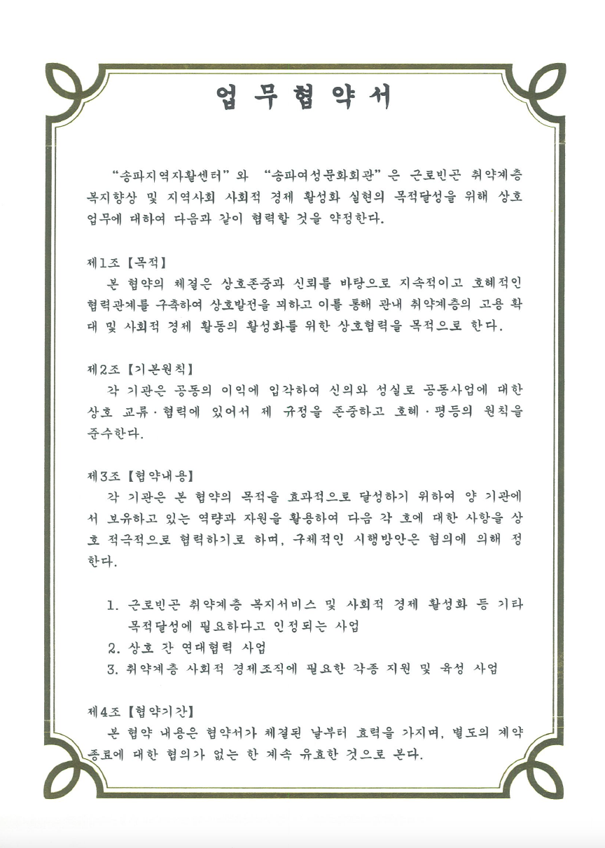송파여성문화회관 업무협약서 페이지 정보 작성자 최고관리자 댓글 댓글 0건 조회Hit 155회 작성일Date 24-01-25 15:36 본문 송파여성문화회관 업무협약서 목록 이전글가락본동 송파키움센터 업무 협약 ♥️ 25.01.31 다음글여성친화일촌기업 협약서 24.01.25 댓글 0 댓글목록 등록된 댓글이 없습니다.
